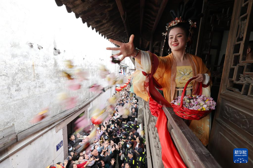4月5日,在德清县新市古镇举行的蚕花庙会上,“蚕花娘娘”在撒蚕花。