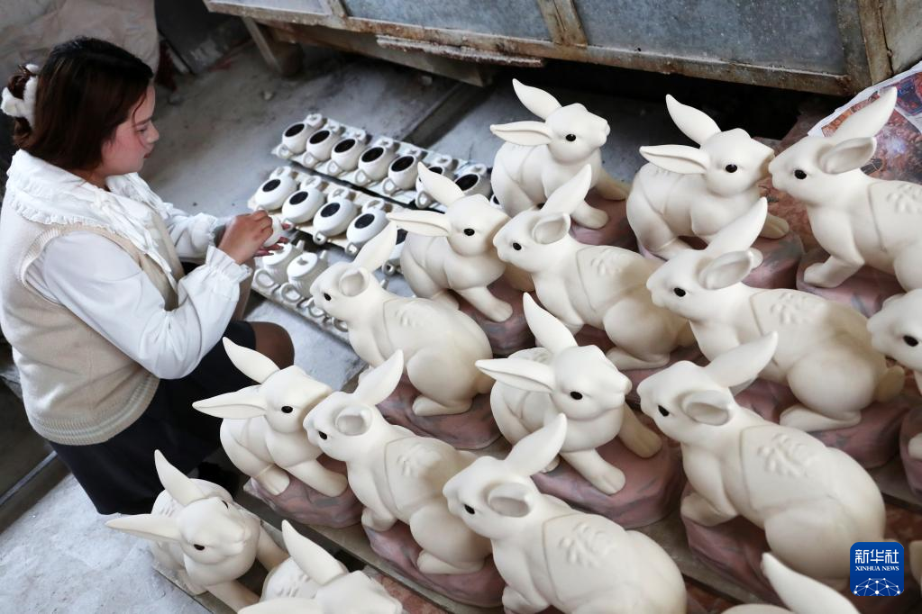 4月12日,在禹州市神垕古镇一家钧瓷企业,一位员工为钧瓷素胎上釉色。