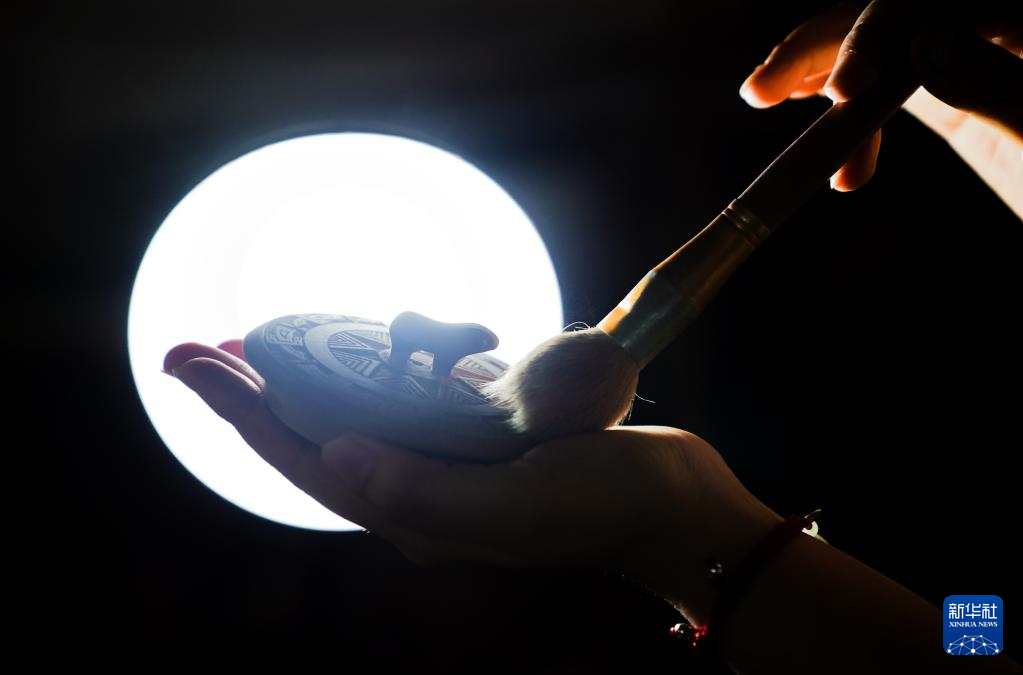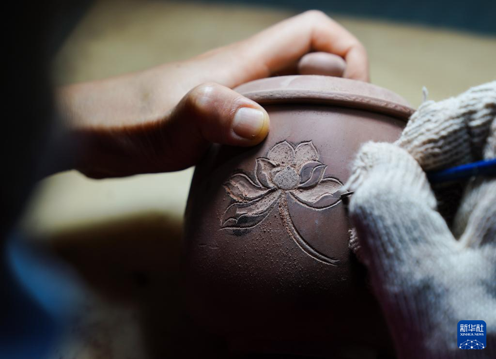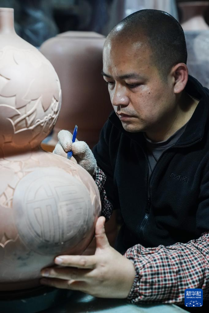 4月11日,在广西钦州市,员工在坭兴陶生产车间进行雕刻工作。