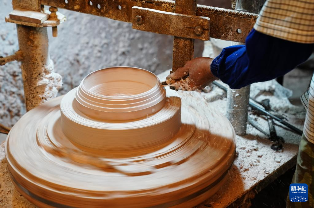 4月11日,在广西钦州市,员工在坭兴陶生产车间工作。