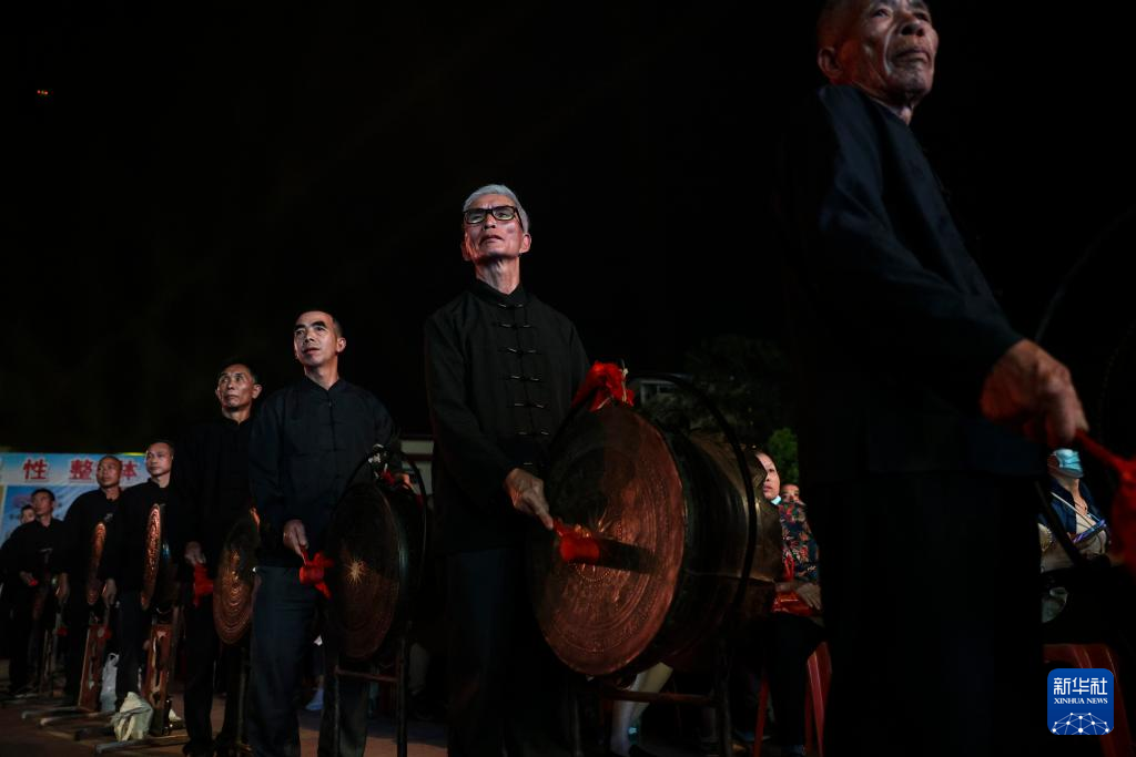 4月17日,群众在开幕式上敲击铜鼓。