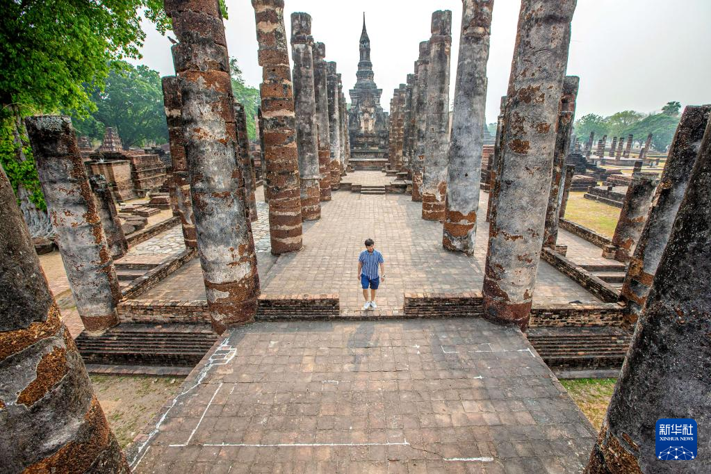 4月17日,游客在泰国素可泰古城遗址拍照。