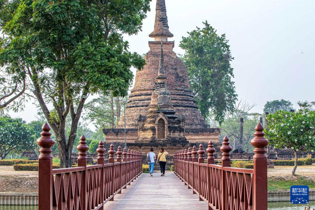 4月16日,游客在泰国素可泰古城遗址游览。