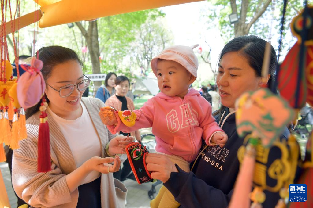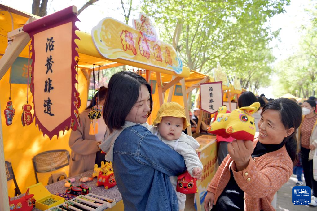 4月18日,市民在东营市清风湖黄河大集上参观非遗展。