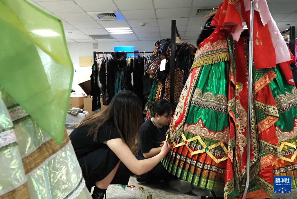 4月19日,中方服装团队工作人员在补缀《剧院魅影》女主角的一套戏服。