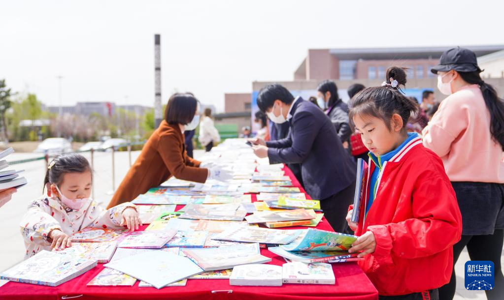 4月22日,市民在吉林省图书馆前的“换书大集”挑选图书。