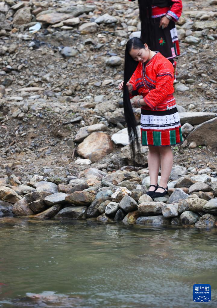 4月22日,一名瑶族妇女在河边梳洗长发。