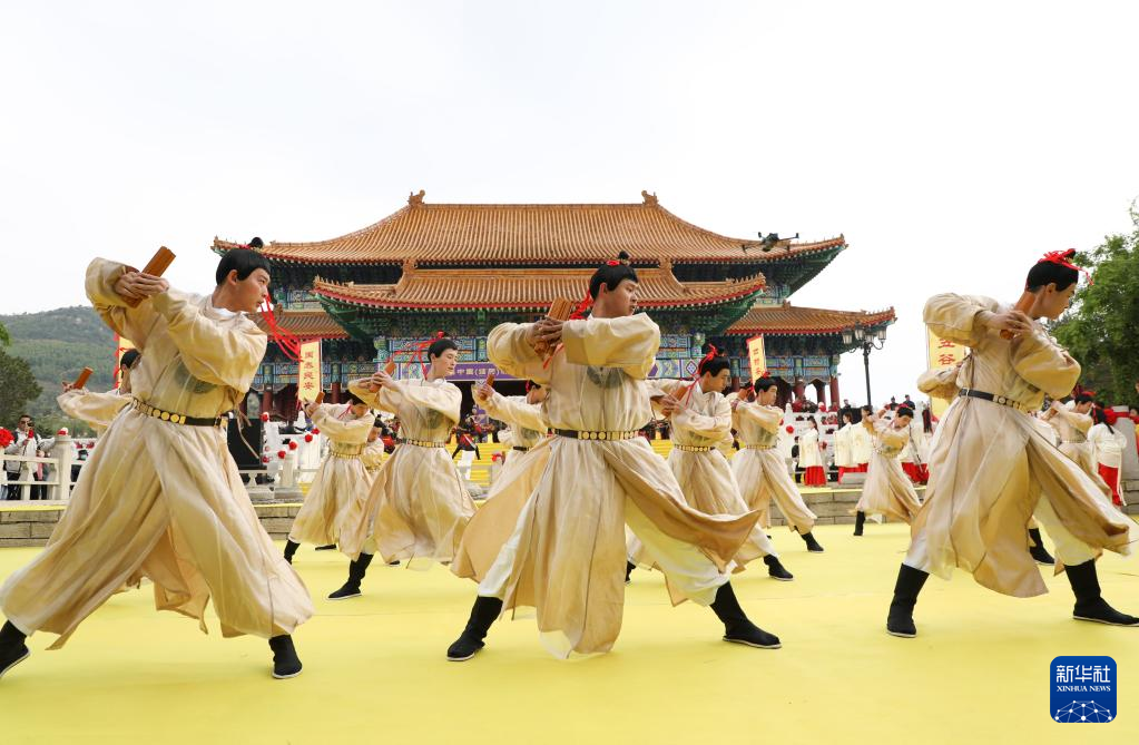 4月25日,在山东沂山风景区,演员在祀山大典上表演“乐舞”。