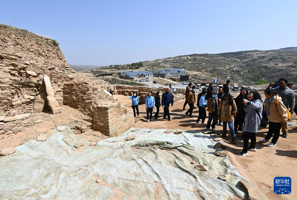 4月26日,外宾在陕西石峁遗址皇城台遗址参观调研。