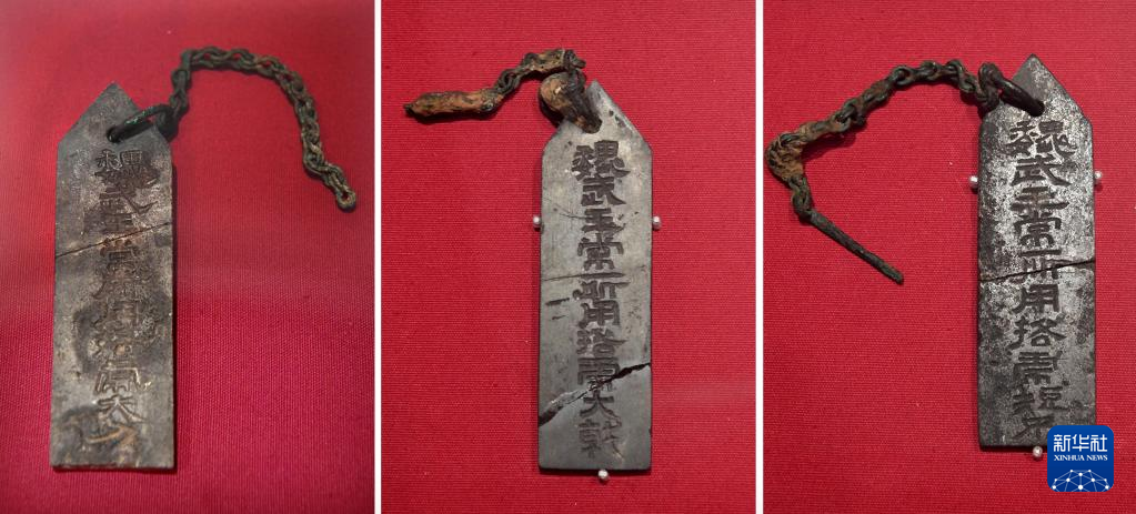 这是曹操高陵遗址博物馆内展出的“魏武王常所用挌虎大刀”(左)“魏武王常所用挌虎大戟”(中)“魏武王常所用挌虎短矛”石牌(拼版照片,4月22日摄)。