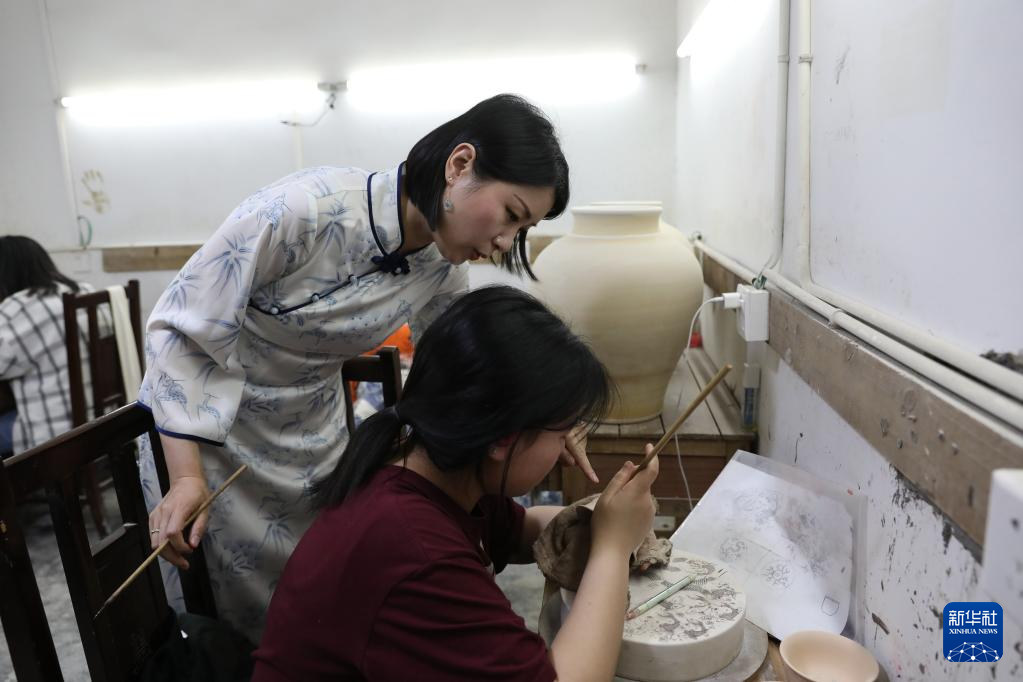 4月19日,在江西景德镇,蔡文娟(右)向“青花故事”创作基地的成员讲授青花相关知识。