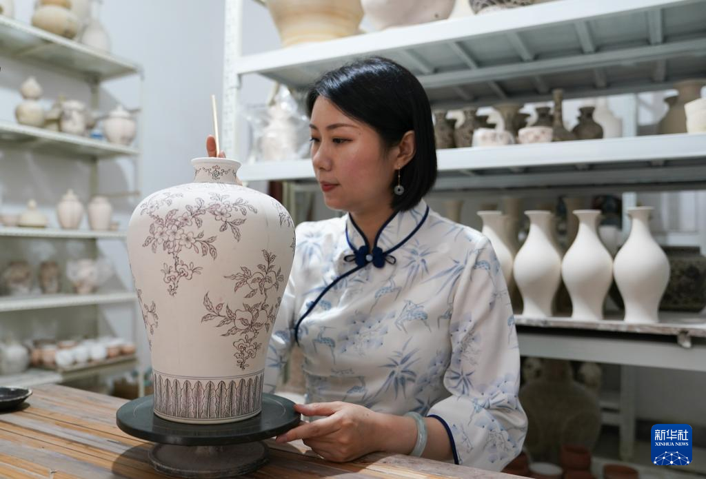 4月19日,在江西景德镇,蔡文娟在“青花故事”创作基地绘制青花图案。