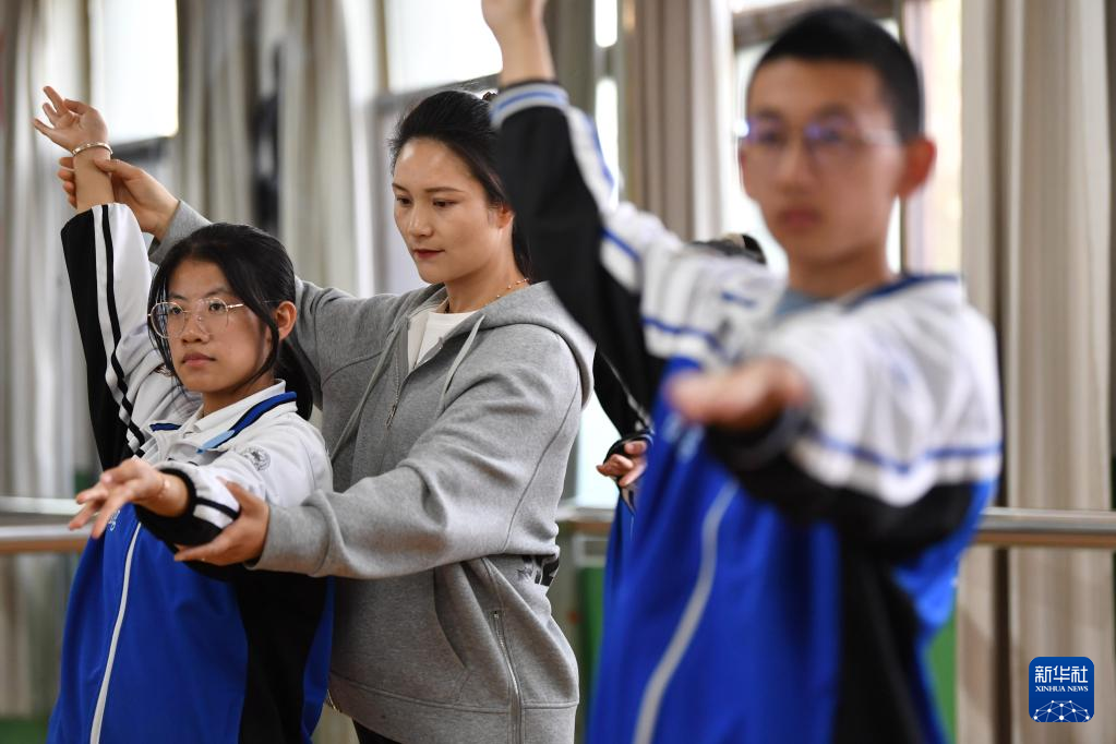 敦煌中学教师张梦婷(右)在舞蹈教室给学生纠正敦煌舞课间操的动作(4月26日摄)。
