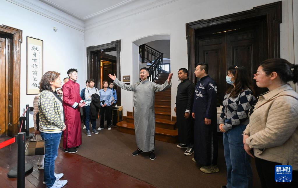 4月29日,在天津市河北区梁启超纪念馆饮冰室,话剧演员与游客进行互动式沉浸演出。新华社记者 孙凡越 摄