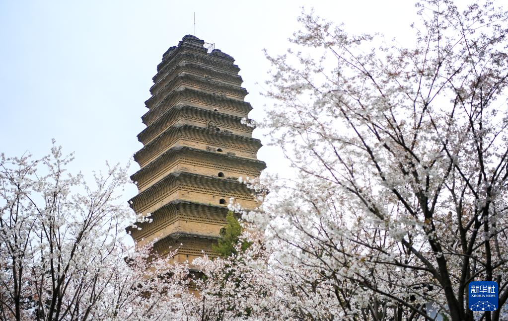 春花掩映中的西安小雁塔(3月15日摄)。