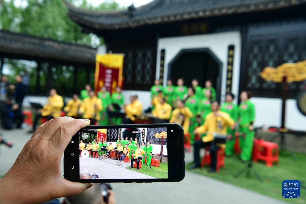 5月6日,国家级非遗项目邵伯锣鼓小牌子表演团在江苏省扬州市江都区邵伯镇斗野园表演。