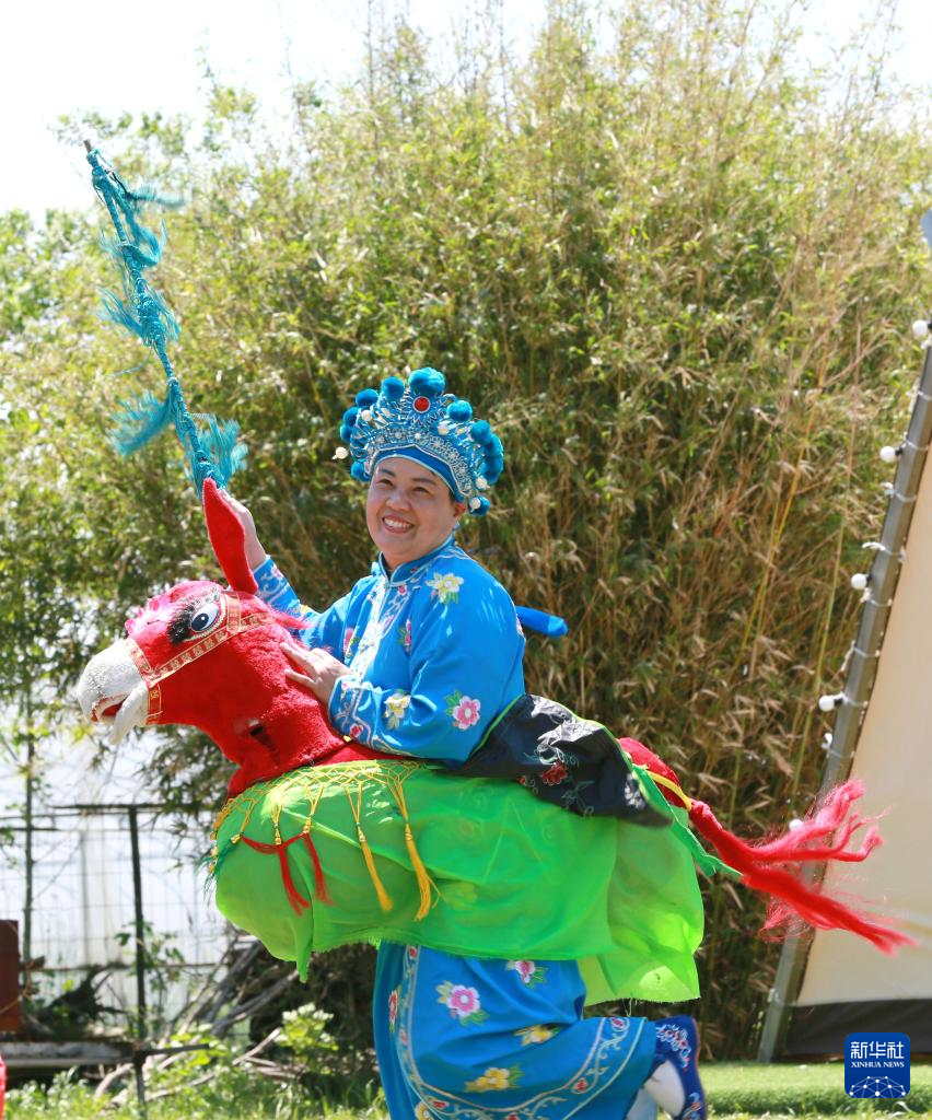 5月7日,江苏省级非遗项目吴桥社火表演队在江苏省扬州市江都区吴桥镇白塔河生态度假庄园为游客表演。