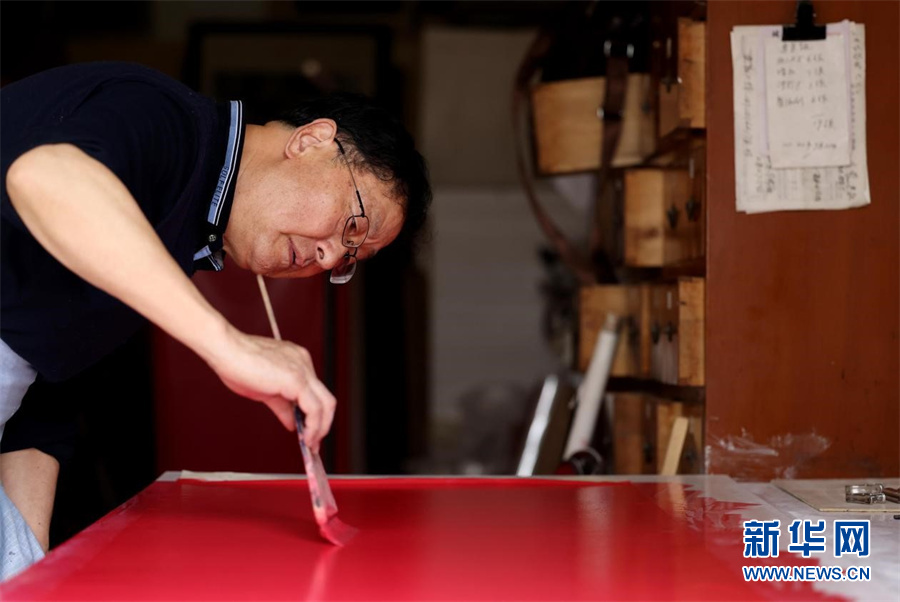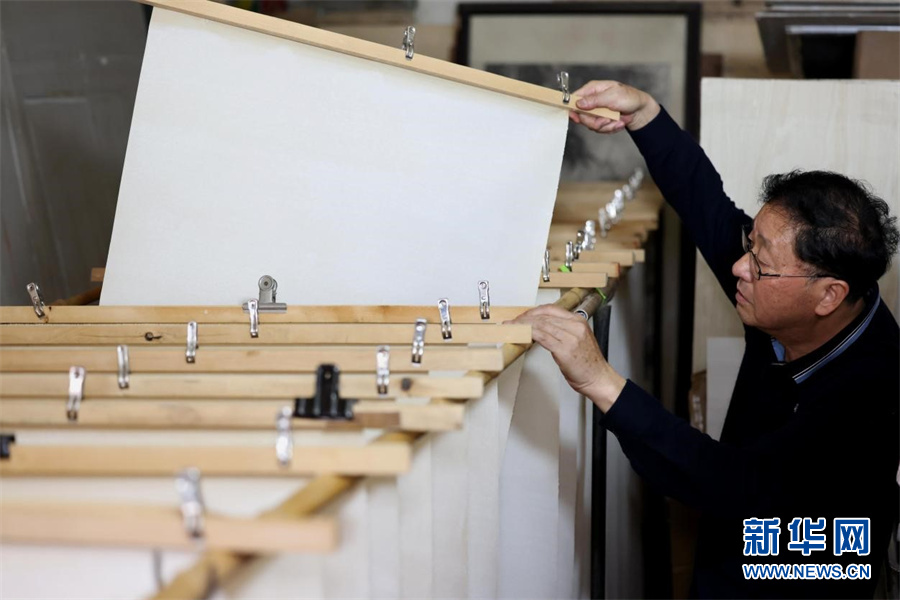 近日,宫廷描金纸省级非遗传承人范发生在工作室进行纸张吊晾。