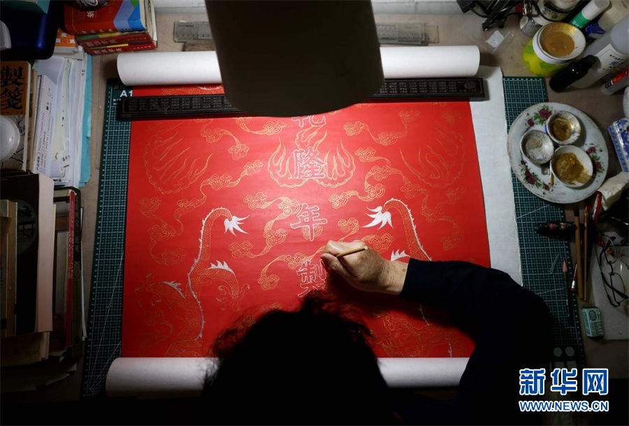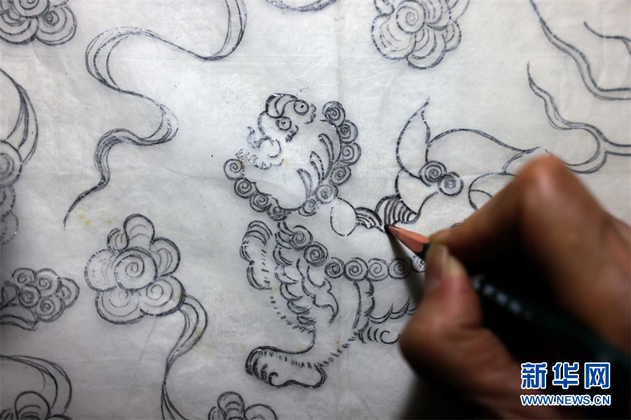 近日,宫廷描金纸省级非遗传承人范发生在进行描金纸画稿拷贝。