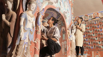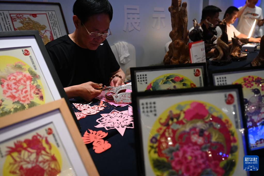 5月16日,民间艺人张林展示满族手工剪纸技艺。