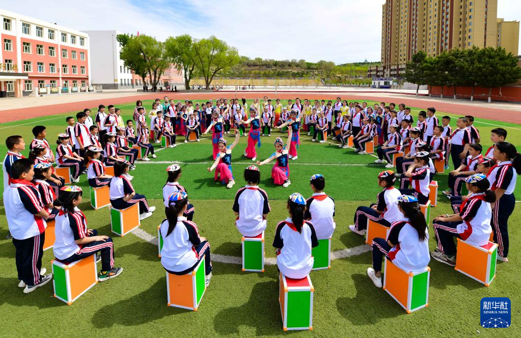 5月17日,乌兰浩特市山城路小学学生在“戏曲传承进校园 梨园雅韵润童心”主题活动中展示课间戏曲操。