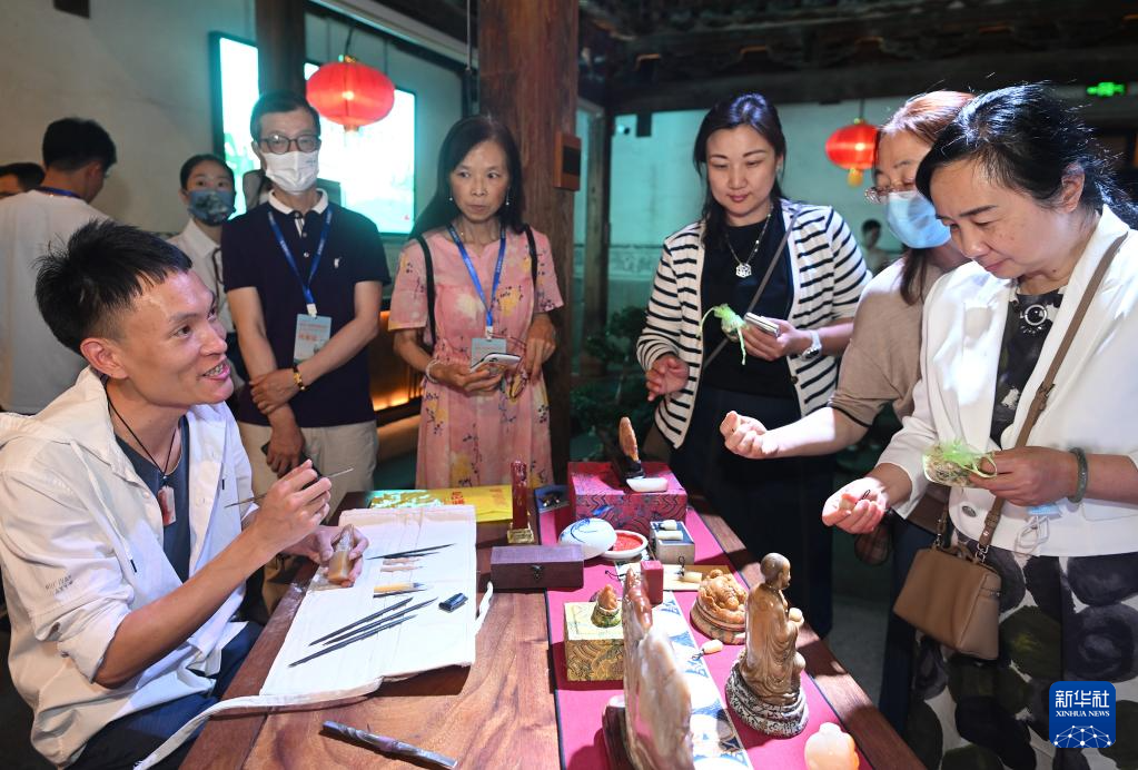 5月18日,非遗传承人在福州市三坊七巷历史文化街区向观众展示寿山石雕制作工艺。