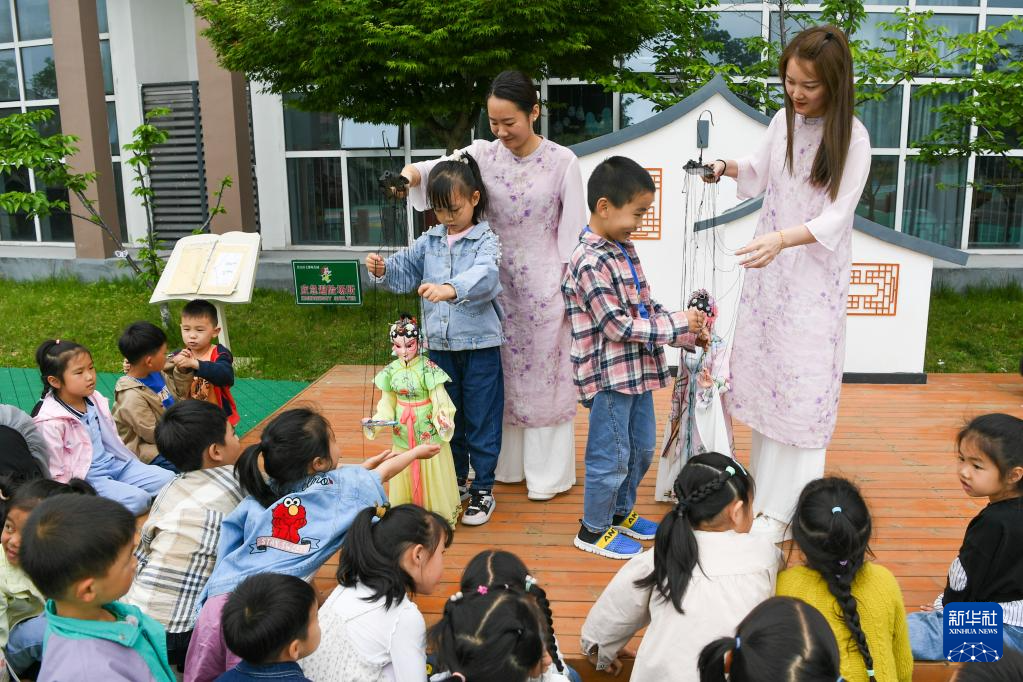 在七都幼儿园,小朋友与提线木偶互动(4月20日摄)。