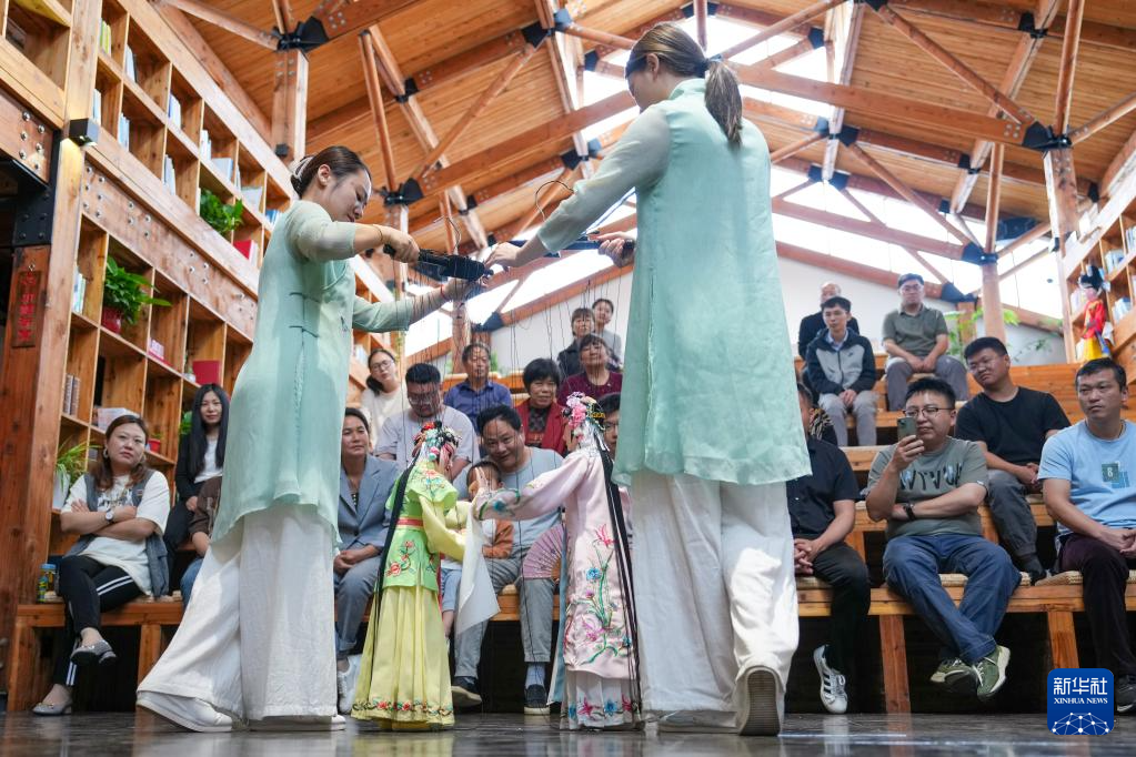 孙菁和施锦芳在七都镇江村文化礼堂表演昆曲木偶(5月17日摄)。