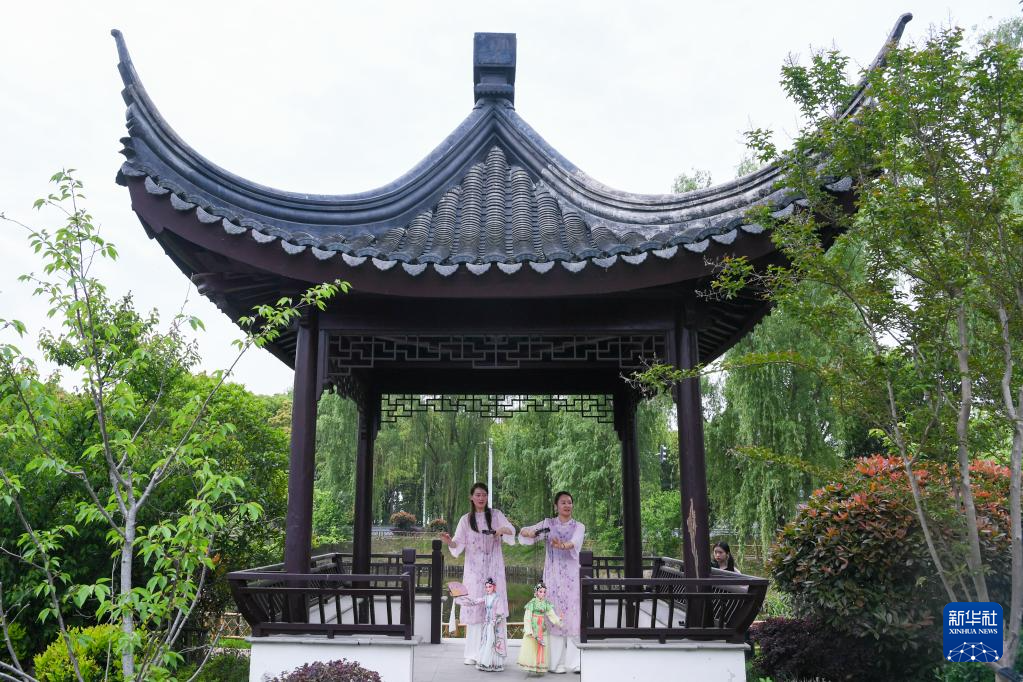 孙菁(右)和施锦芳在苏州市吴江区七都镇一处公园内排练(4月18日摄)。