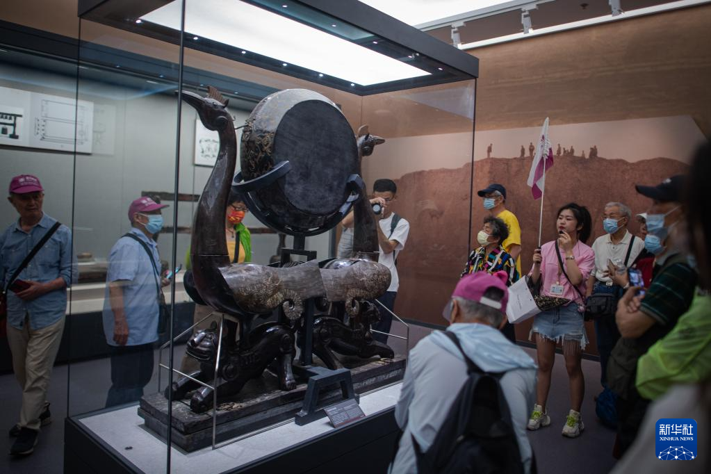 5月20日,在熊家冢国家考古遗址公园,游客在车马坑前参观。
