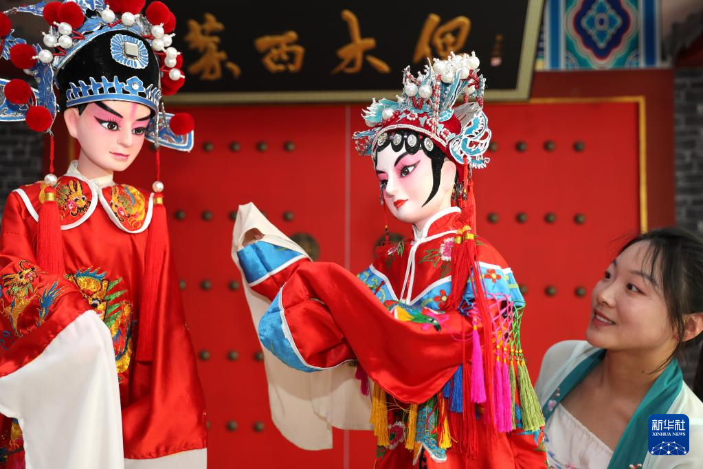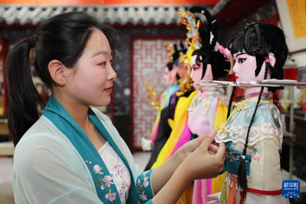 5月21日,在山东青岛,莱西木偶艺术团的演员在整理木偶装扮。