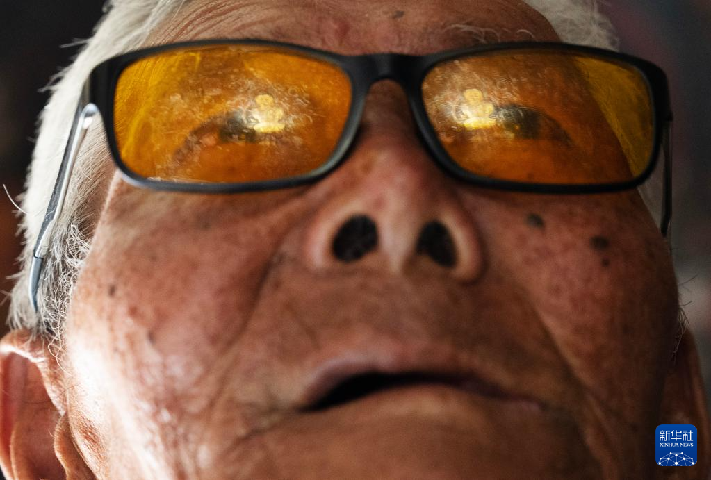 5月26日,仁增旺扎老人在观看石窟里的壁画时,一幅金色的佛像壁画映在他的眼镜上。