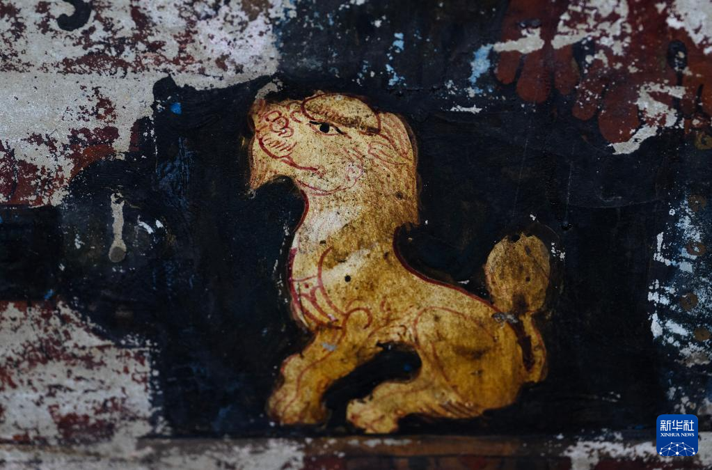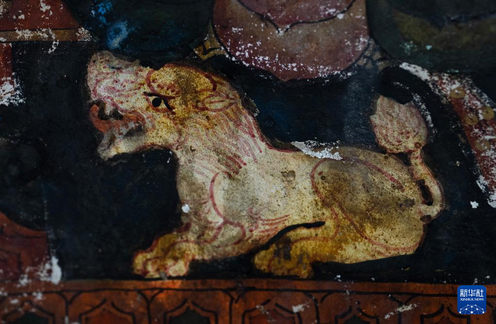 这是5月26日拍摄的皮央石窟壁画中的狮子像。