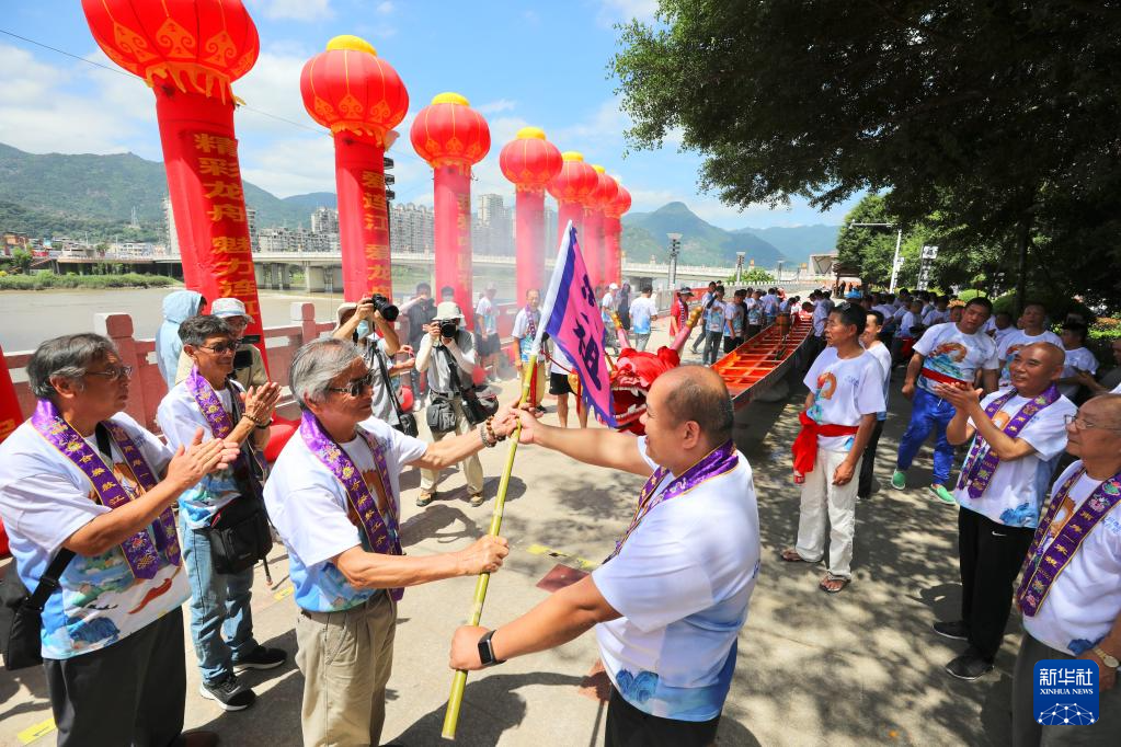 5月31日,福州市连江县两岸龙舟文化交流协会会长林筱江(前右)向马祖乡亲代表曾林官赠送新龙舟。
