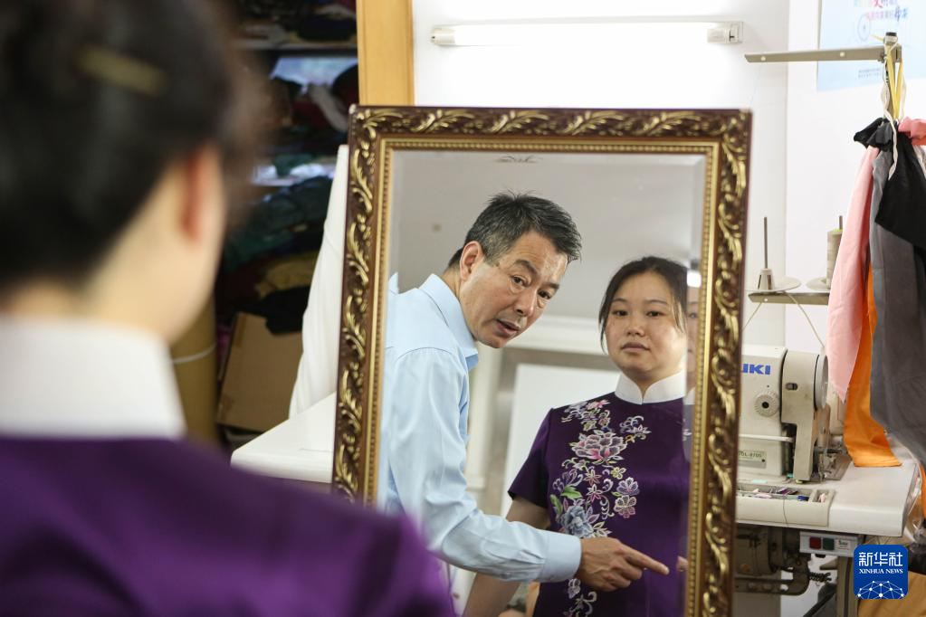 5月31日,江满宗(后)在上海市“龙凤旗袍制作技艺——国家级非物质文化遗产传习所”为徒弟吴雨婷传授技艺。