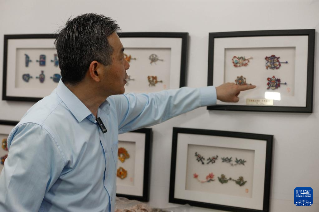 5月31日,江满宗在上海市“龙凤旗袍制作技艺——国家级非物质文化遗产传习所”展示盘扣。