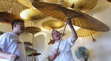 5月31日,江满宗在上海市“龙凤旗袍制作技艺——国家级非物质文化遗产传习所”检查布料。