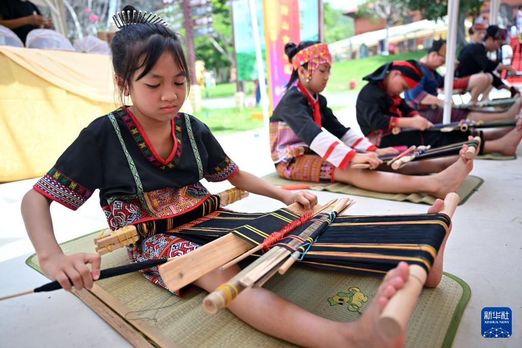 6月10日,2023年“文化和自然遗产日”海南省宣传展示暨第三届三亚南山非遗节在三亚市南山文化旅游区举行,小朋友在展示黎族织锦技艺。