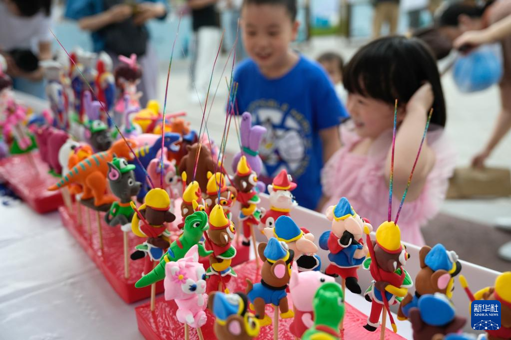 6月10日,扬州举行非遗传承系列活动,非遗互动体验集市上的扬州面塑吸引了小朋友的目光。