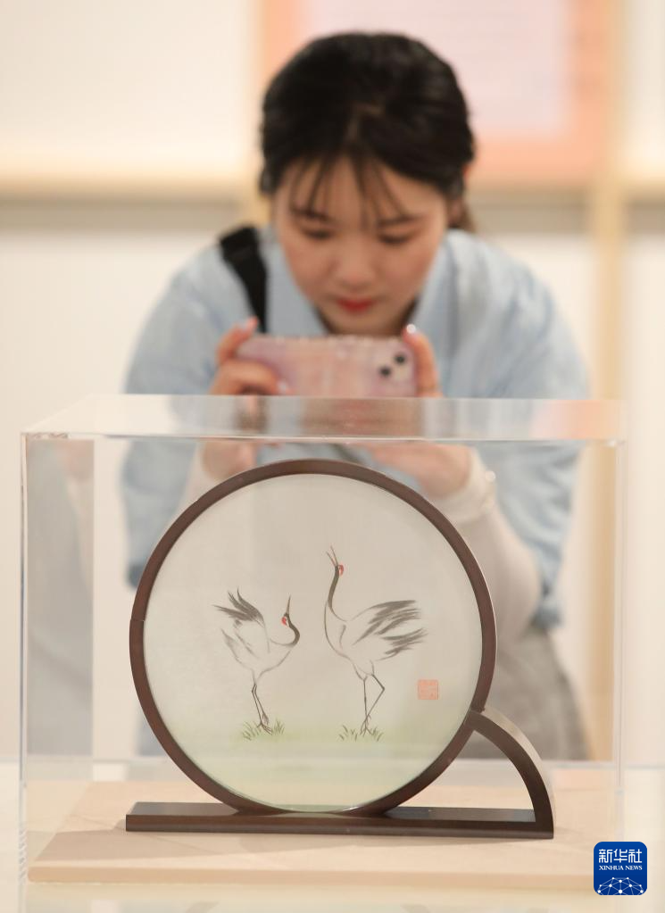 6月10日,一名市民在江苏苏州美术馆用手机拍摄展出的非遗刺绣作品。