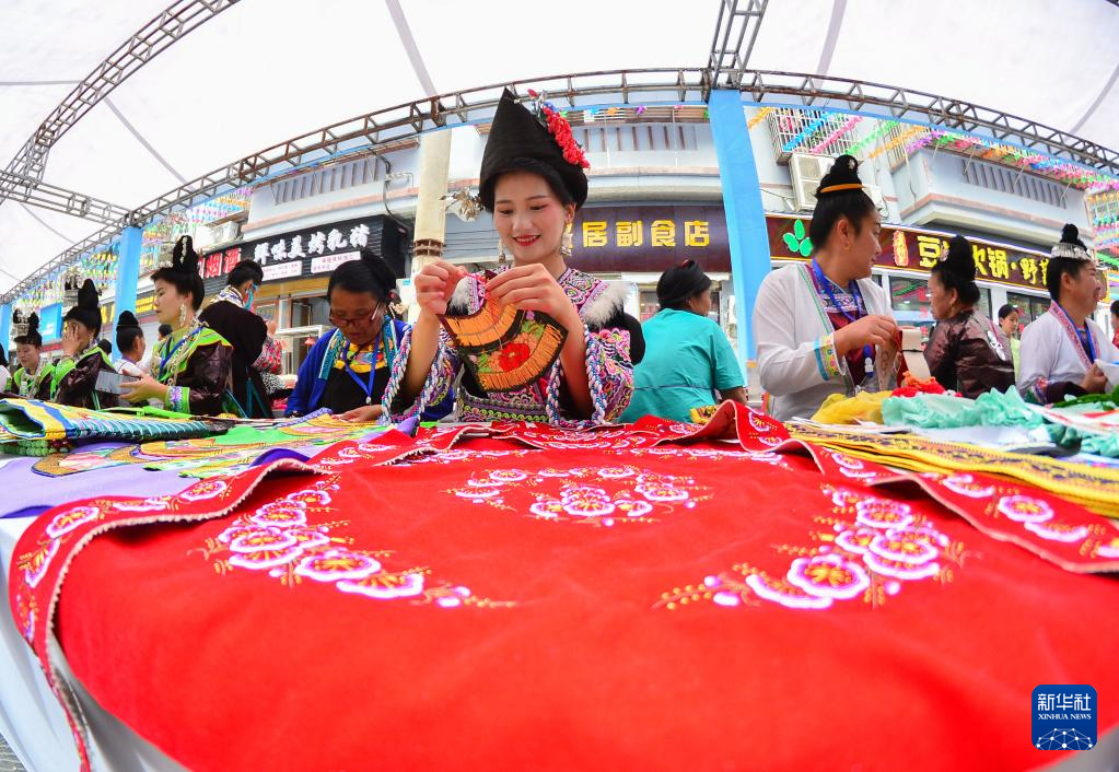 6月10日,绣娘在贵州省从江县举办的文化和自然遗产日集市上展示刺绣技艺。