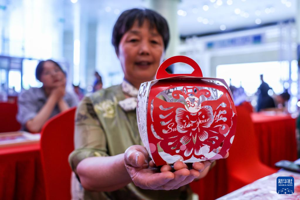 6月10日,山东省济南市历下区举行第四届剪纸大赛,一名参赛者在现场展示自己创作的剪纸作品。