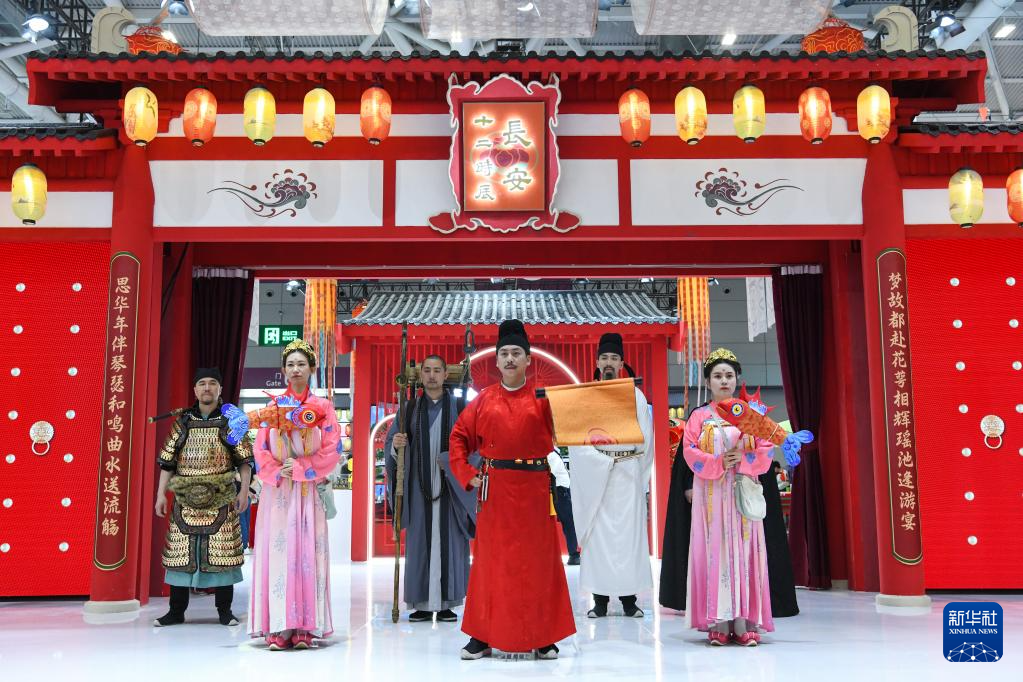 6月9日,在文博会“文旅消费馆·一带一路国际馆”陕西展台,身着古装的工作人员欢迎观众的到来。