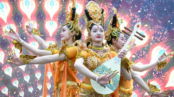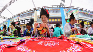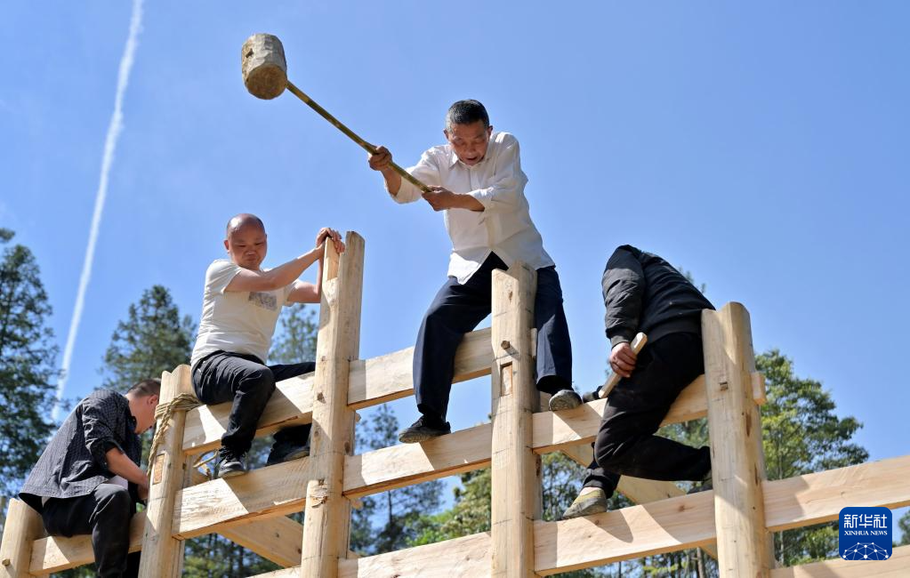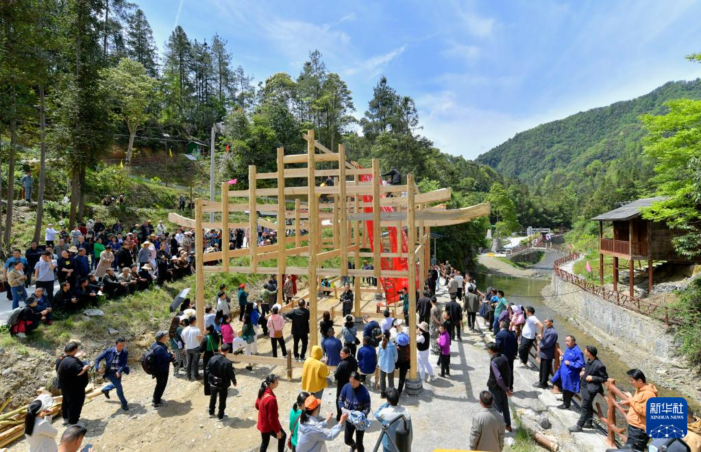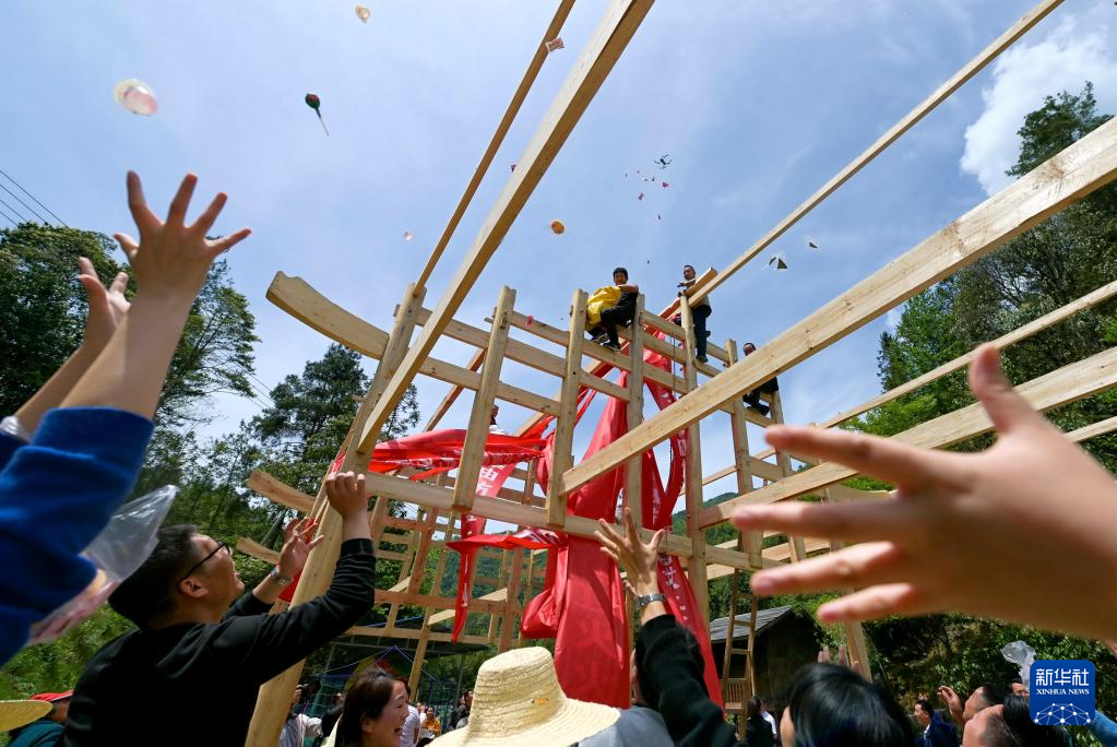 4月26日,在湖北省宣恩县沙道沟镇老岔村,村民在举行吊脚楼落成仪式。