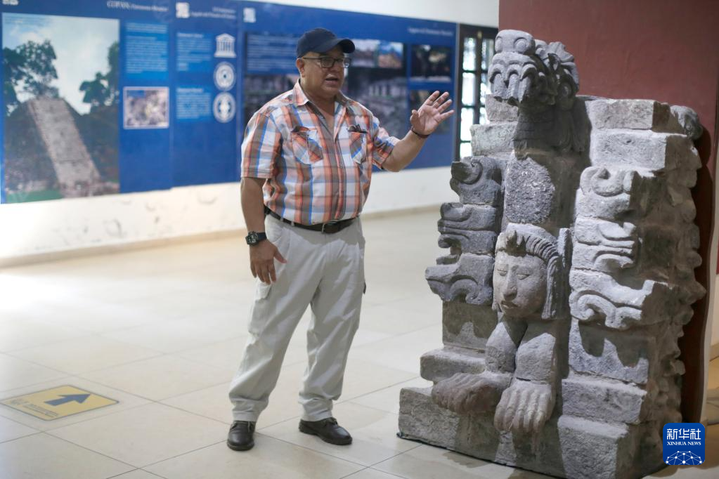 6月8日,在洪都拉斯科潘遗址入口陈列厅,洪都拉斯人类学和历史研究所西部地区代表萨尔瓦多·马丁内斯介绍联合考古队发现的龙头雕像。新华社发(卢西奥·塔沃拉摄)