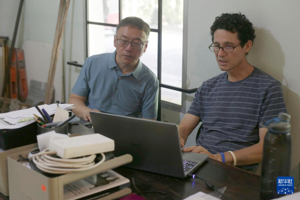 6月8日,在洪都拉斯科潘玛雅遗址中洪联合考古队办公室,中国社科院考古研究所“玛雅文明中心科潘遗址考古及中美洲文明研究”项目中方负责人李新伟(左)与洪方负责人拉莫斯交谈。新华社发(卢西奥·塔沃拉摄)