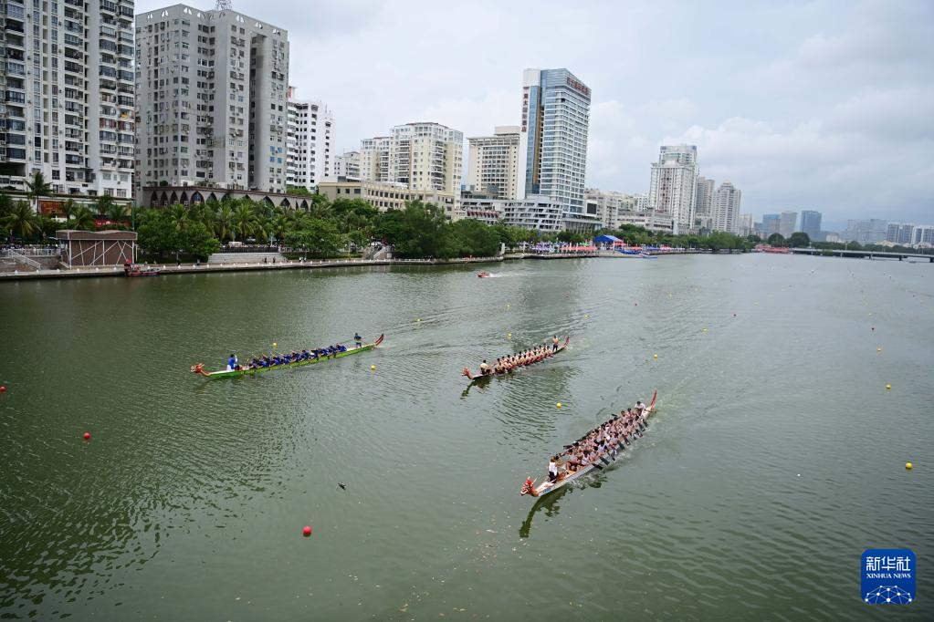 6月18日,龙舟队在海南省三亚市三亚河上进行比赛。