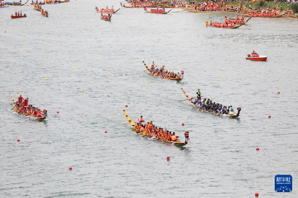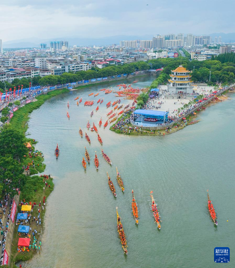 端午节临近,湖南道县举行非遗龙船赛,众多龙船在潇水河上竞渡,迎接佳节到来。
