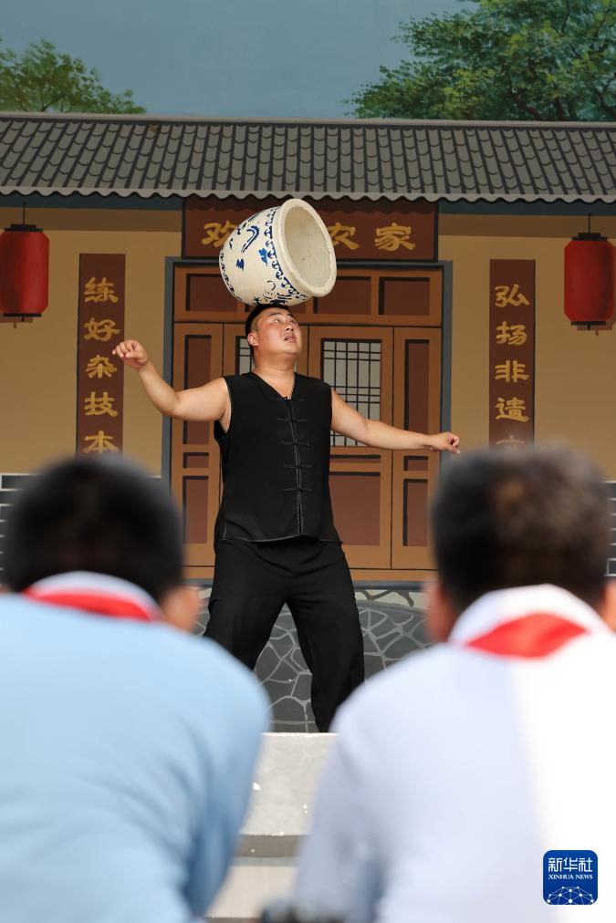 7月20日,在河北省沧州市吴桥县吴桥杂技大世界景区,杂技演员为吴桥县新兴路小学学生展示传统杂技项目。
