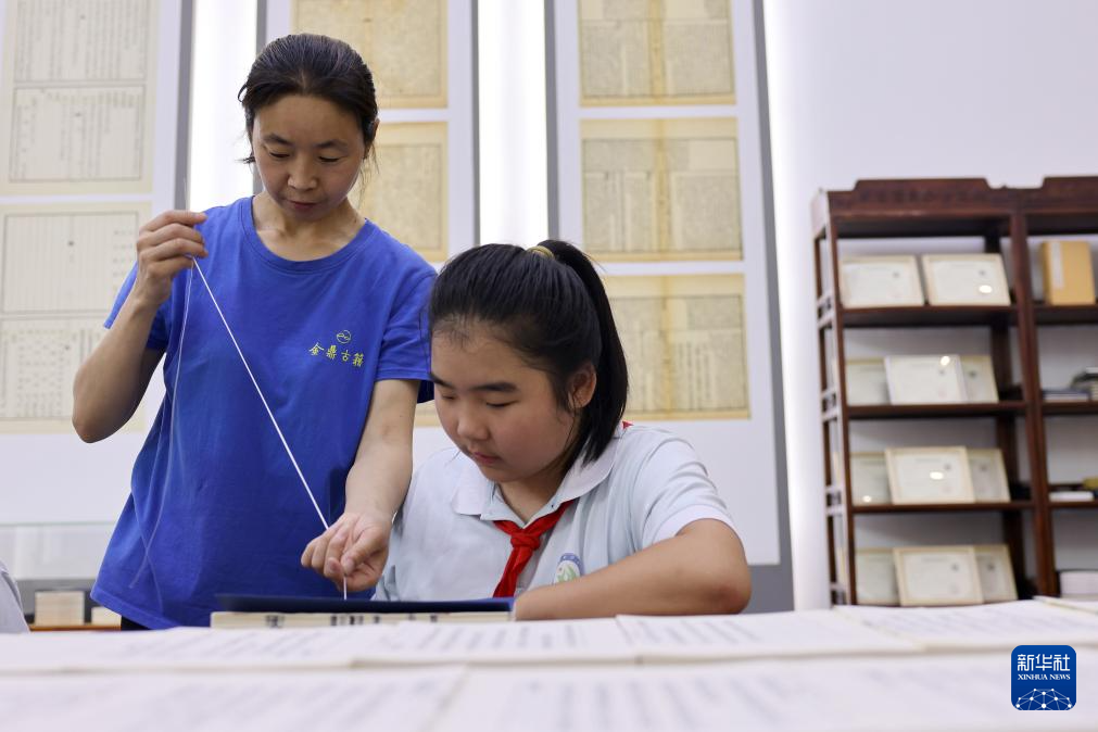 7月20日,在河北省沧州市吴桥县河北线装书博物馆,工作人员教吴桥县新华小学学生学习线装书制作技艺。